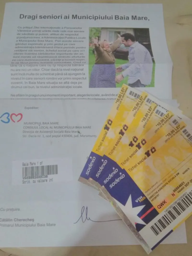 Tichetele în valoare de 50 de lei sunt expediate împreună cu o scrisoare semnată de Cătălin Cherecheș și deja au ajuns la destinatari, care sunt și alegători în 27 septembrie. Acțiunea este asumată și în scrisoare și pe pagina oficială a Municipiului Baia Mare.