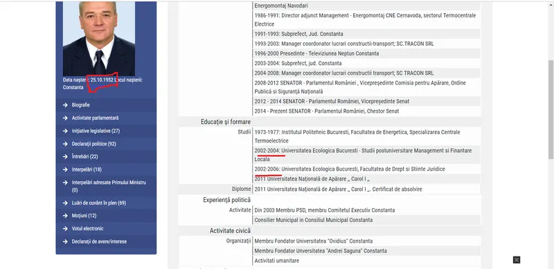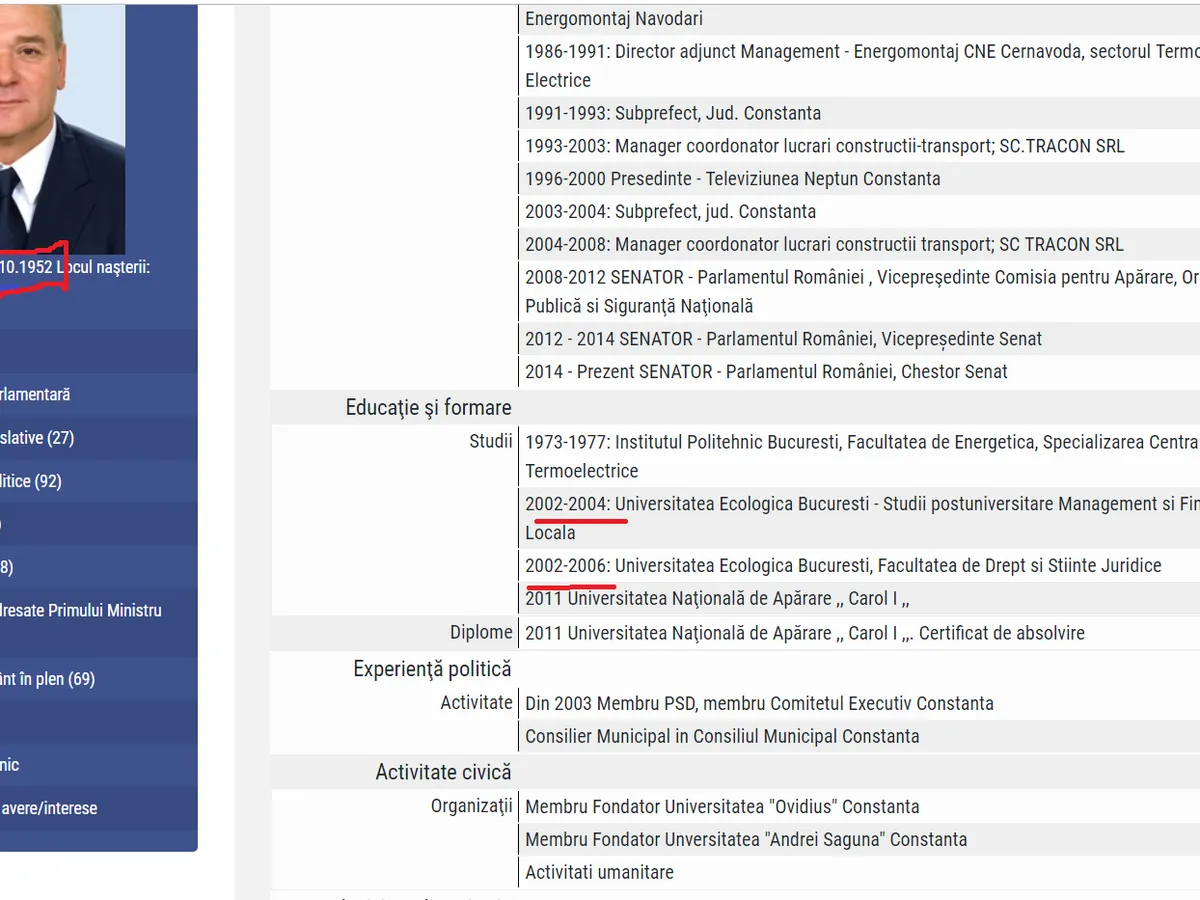 La 50 de ani s-a înscris, în același timp, la „Studii postuniversitare Management și Finanțare Locală” și la ”Facultatea de Drept și Știinte Juridice”, ambele la Universitatea Ecologică București, privată. El lucra la Constanța, la 200 kilometri depărtare.