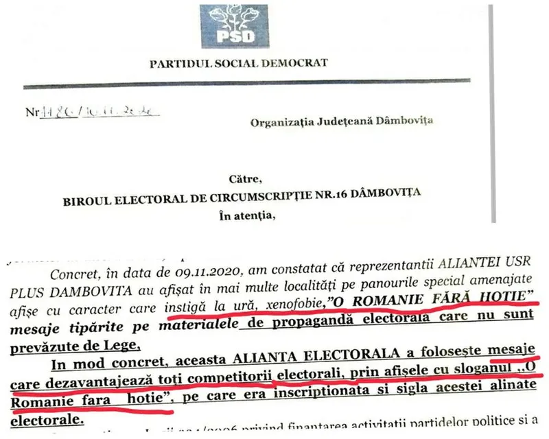 PSD Dâmbovița a cerut să interzică USR-PLUS Dâmbovița „să folosească mijloace de propagandă electorală care nu sunt permise de către lege” și să constate „incidența dispozițiilor art.65, alin. (5) din Legea 208/2015 - În campania electorală se interzice folosirea mesajelor sau sloganurilor cu caracter discriminatoriu ori a mesajelor de incitare la ură sau intoleranță”.