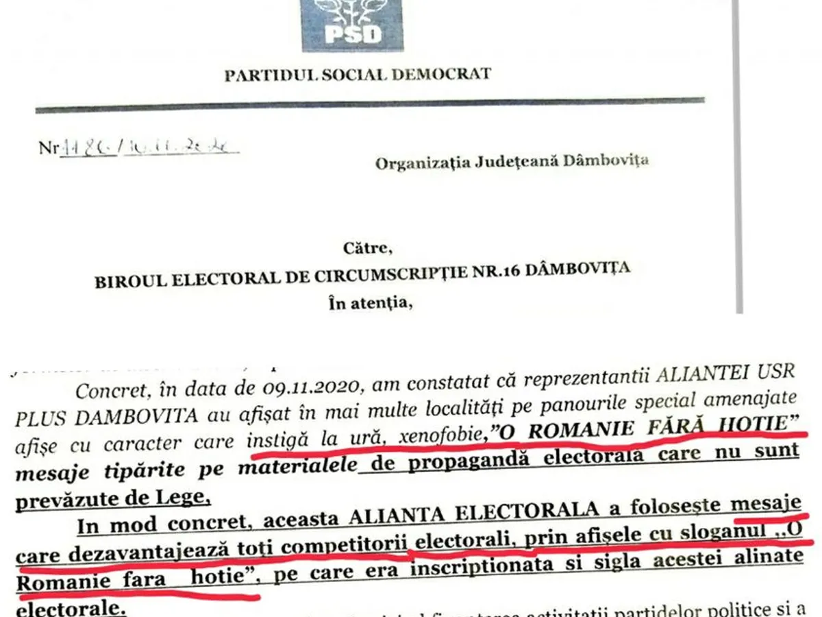 Biroul Electoral de Circumscripție Dâmbovița a admis azi sesizarea PSD care a cerut interzicerea promovării sloganului „O Românie fără hoție" al Alianței USR PLUS pe motiv de "defăimare".