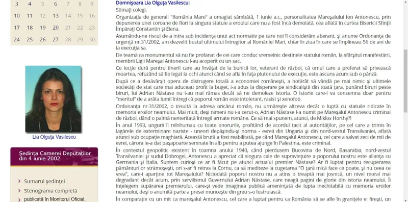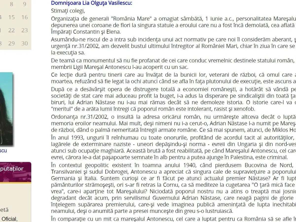 Lia Olguța Vasilescu contesta ordonanța de urgență nr. 31/2002 privind interzicerea organizațiilor și simbolurilor cu caracter fascist, rasist sau xenofob și a promovării cultului persoanelor vinovate de săvârșirea unor infracțiuni contra păcii și omenirii a guvernului Năstase.