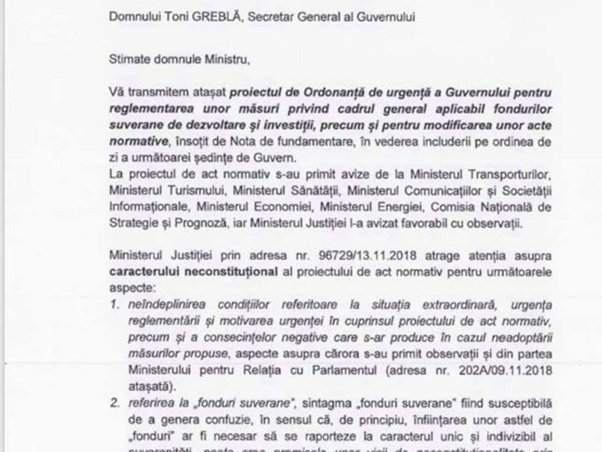 Un document publicat pe pagina de Facebook a fostului premier Victor Ponta arată că Ministerul Justiției apreciază că ordonanța de urgență privind Fondul Suveran de Investiții ar putea fi declarată neconstituțională. Cu toate acestea, joi, guvernul Dăncilă a aprobat-o.