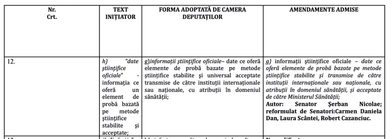 Iar pentru cele trei cuvinte a fost nevoie de patru senatori: "Autor: Senator Șerban Nicolae; reformulat de Senatori:Carmen Daniela Dan, Laura Scântei, Robert Cazanciuc."