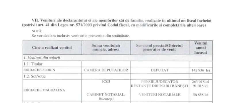 În medie lunară, deci, parlamentarul Florin Iordache câștigă aproape 12.000 de lei din salariu. Magdalena Iordache, soția parlamentarului, încasează din pensie aproape 22.000 de lei lunar. Pe lângă pensie, în 2018, Magdalena Iordache a încasat și niște restanțe salariale de peste 90.000 de lei și aproape 60.000 de lei din activități notariale.