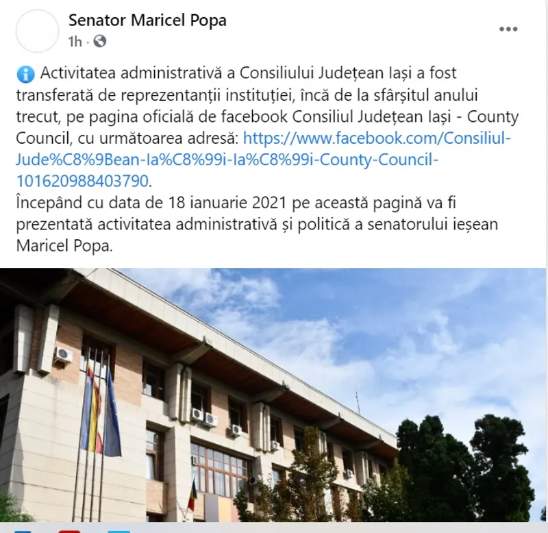 Maricel Popa, ex-șeful Consiliului Județean Iași și actual senator PSD, a preluat pagina de Facebook a CJ Iași.