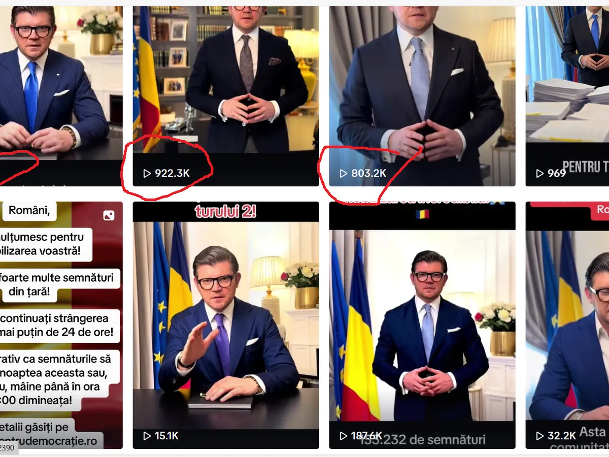 Pisaroglu folosește exact stilul dubios de campanie folosit de Călin Georgescu. Mai jos, aveți o captură în care apar ultimele 3 mesaje video ale lui Pisaroglu. Ele au o audiență fantastică ce ajunge la 900.000.