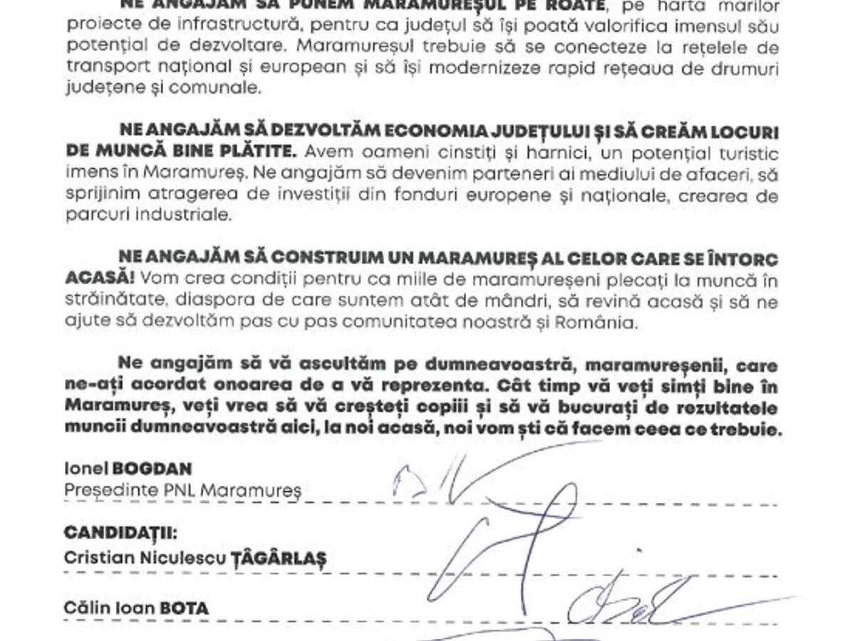 Prin acest document, echipa liberală maramureșeană își ia angajamentul în fața maramureșenilor că va lupta în continuare pentru dezvoltarea și modernizarea județului, prin implementarea proiectelor de infrastructură rutieră – construirea drumurilor expres Baia Mare – Satu Mare, Baia Mare – Jibou și a Centurii Baia Mare, dezvoltarea economiei și crearea de noi locuri de muncă bine plătite, extinderea rețelei de gaze naturale, finalizarea Barajului Runcu – un proiect de o importanță majoră care odată finalizat va alimenta Maramureșul istoric cu apă potabilă, construirea unui nou terminal al Aeroportului Baia Mare, care va deschide un nod de comunicații foarte important pentru rute internaționale, precum și susținerea tuturor proiectelor din Planul lui Bogdan pentru investiții în Maramureș.