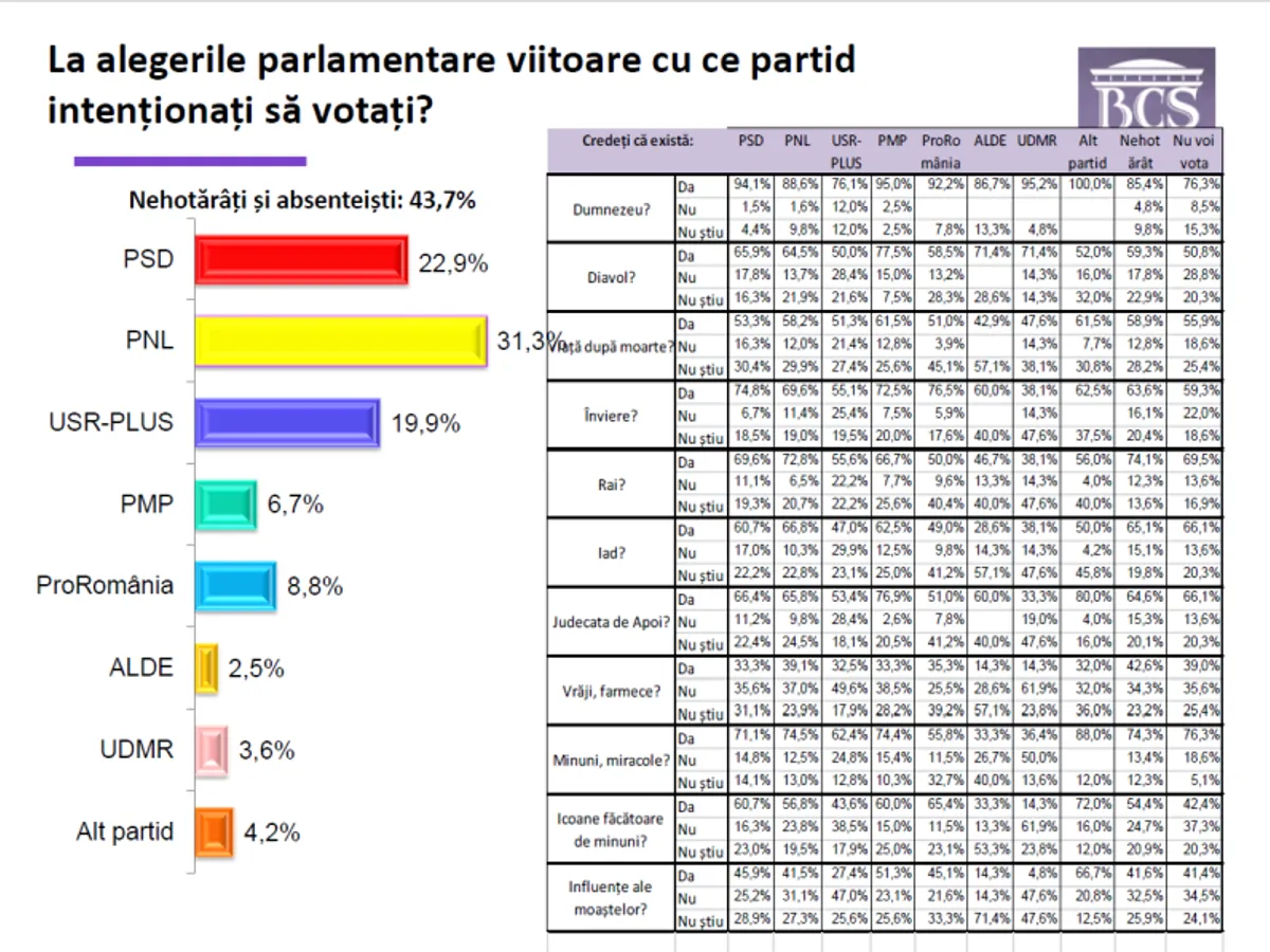 Astfel, liberalii ar obține 31,3% din voturi dacă scrutinul ar avea loc acum, iar PSD 22,9%, social democrații menținându-se aproximativ la nivelul obținut la alegerile europarlamentare din 2019.