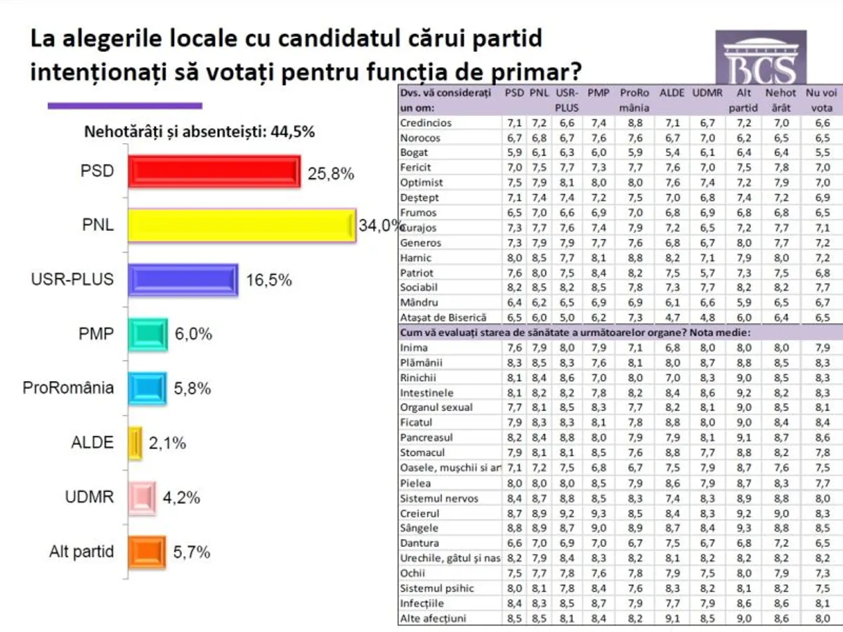 Candidații PNL la funcția de primar ar fi aleși de 34% dintre români, arată chestionarul BCS. PSD ar obține doar 25,8% din electorat, ceea ce ar însemna că ar putea pierde o parte dintre baronii locali din prezent.