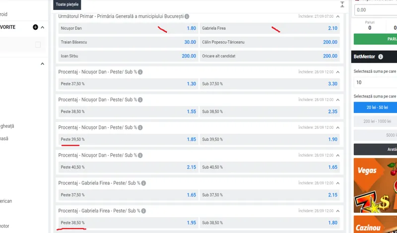 Gabriela Firea are cotele cele mai apropiate pentru pragul de 38,5% (cel mai probabil sub acest prag, cotat în 1,8).