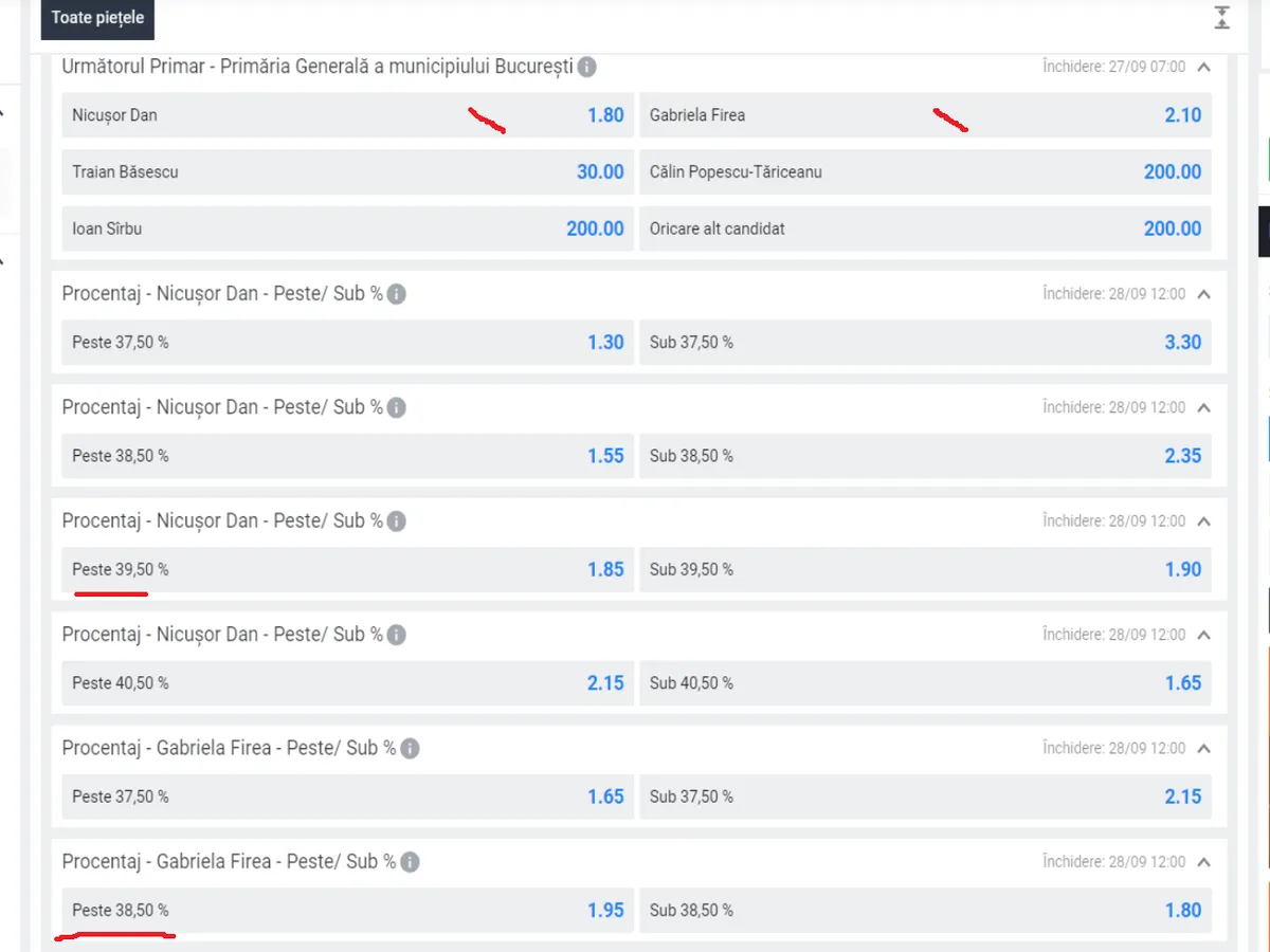 Astfel, cel mai probabil Nicușor Dan va lua în jur de 39,5%. Pentru pariu sub sau peste 39,5%, Dan are aceeași cotă 1,85.