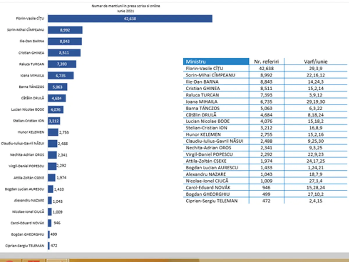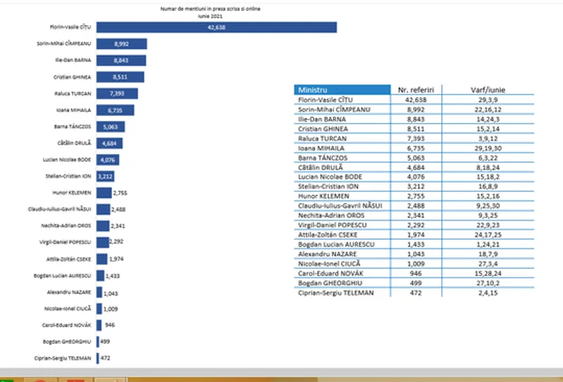 Ministrul Proiectelor Europene Cristian Ghinea urcă patru poziţiii, de pe locul 8 în luna mai, ca urmare a prezentării Planului Naţional de Redresare şi Rezilienţă şi a dezbaterilor intense pe acest subiect. Ministrul Cercetării Ciprian Teleman este tot pe ultimul loc, cu sub 500 de menţiuni. Datele rezultă din Barometrul vizibilităţii miniştrilor, o analiză realizată de News.ro şi de Agenţia de monitorizare Klarmedia, pe baza monitorizării presei scrise şi online.