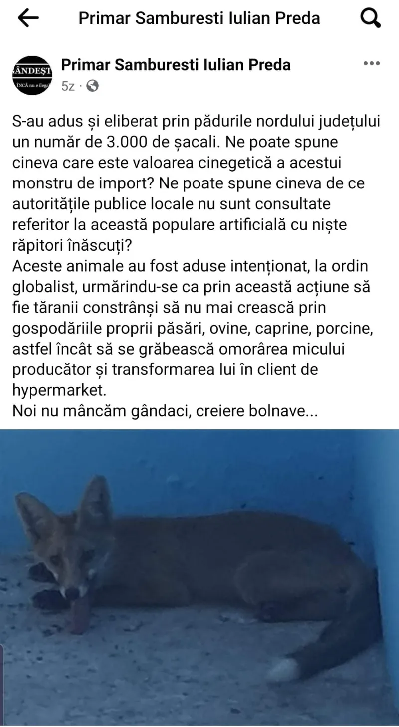 „S-au adus și eliberat prin pădurile nordului județului un număr de 3.000 de șacali. Ne poate spune cineva care este valoarea cinegetică a acestui monstru de import? Ne poate spune cineva de ce autoritățile publice locale nu sunt consultate referitor la această populare artificială cu niște răpitori înăscuți?