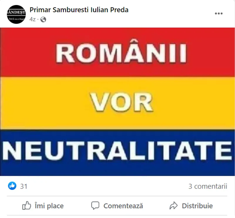 Pe aceeași pagină de Facebook, Preda face propagandă în favoarea „neutralității” României în războiul din Ucraina.