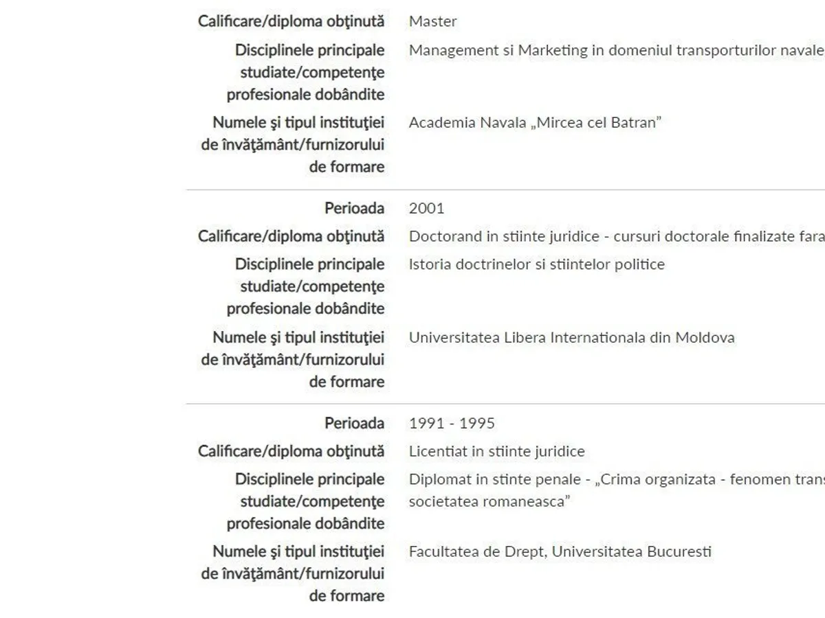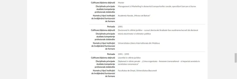 În cv-ul său acesta menționează că, din anul 2001, este „Doctorand în științe juridice - cursuri doctorale finalizate fără susținerea lucrării de doctorat”, la disciplina „Istoria doctrinelor și științelor politice”.