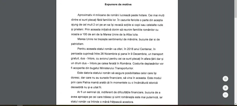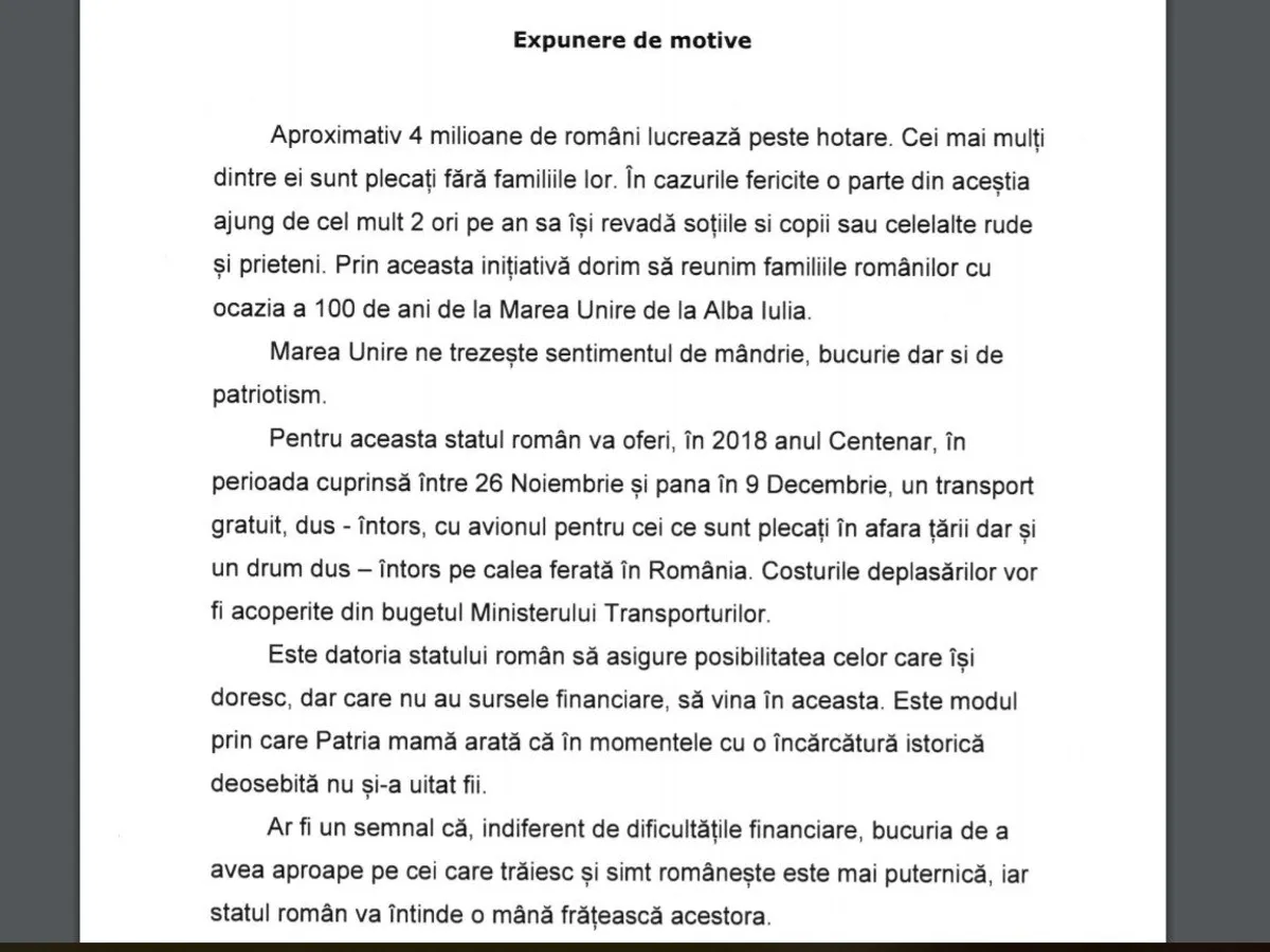 În „Expunerea de motive” se arăta că: „aproximativ 4 milioane de români lucrează peste hotare. Cei mai mulți dintre ei sunt plecați cu familiile lor… Prin această inițiativă dorim să reunim familiile românilor cu ocazia a 100 de ani de la Marea Unire de la Alba Iulia.”