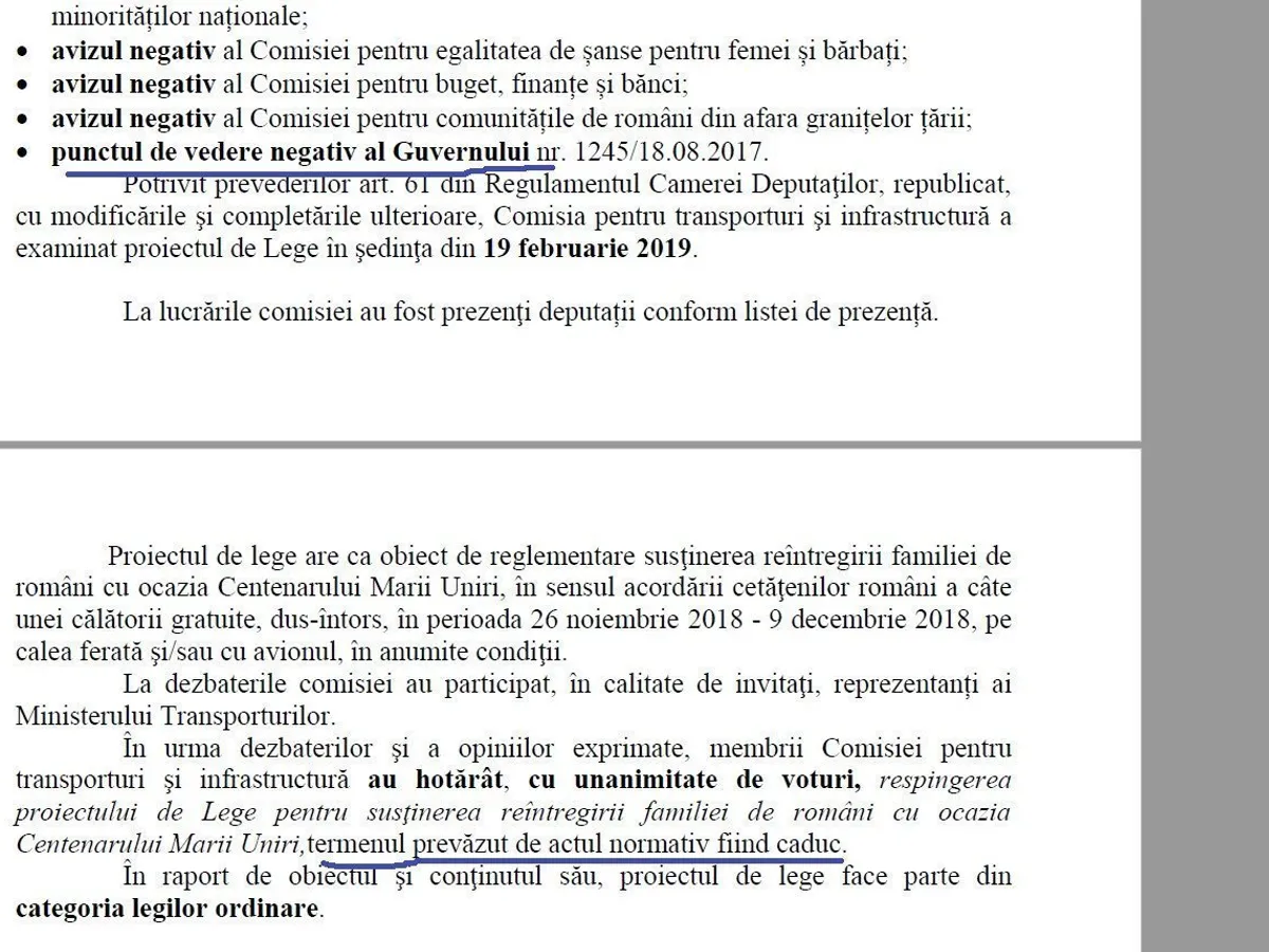 Dar fiind că Centenarul trecuse, deputații din Comisie nu au mai putut decât să „hotărască cu unanimitate de voturi, respingerea proiectului de Lege pentru susținerea reîntergirii familiei de români cu ocazia Cntenarului Marii Uniri, termenul prevăzut de actul normativ fiind caduc”.