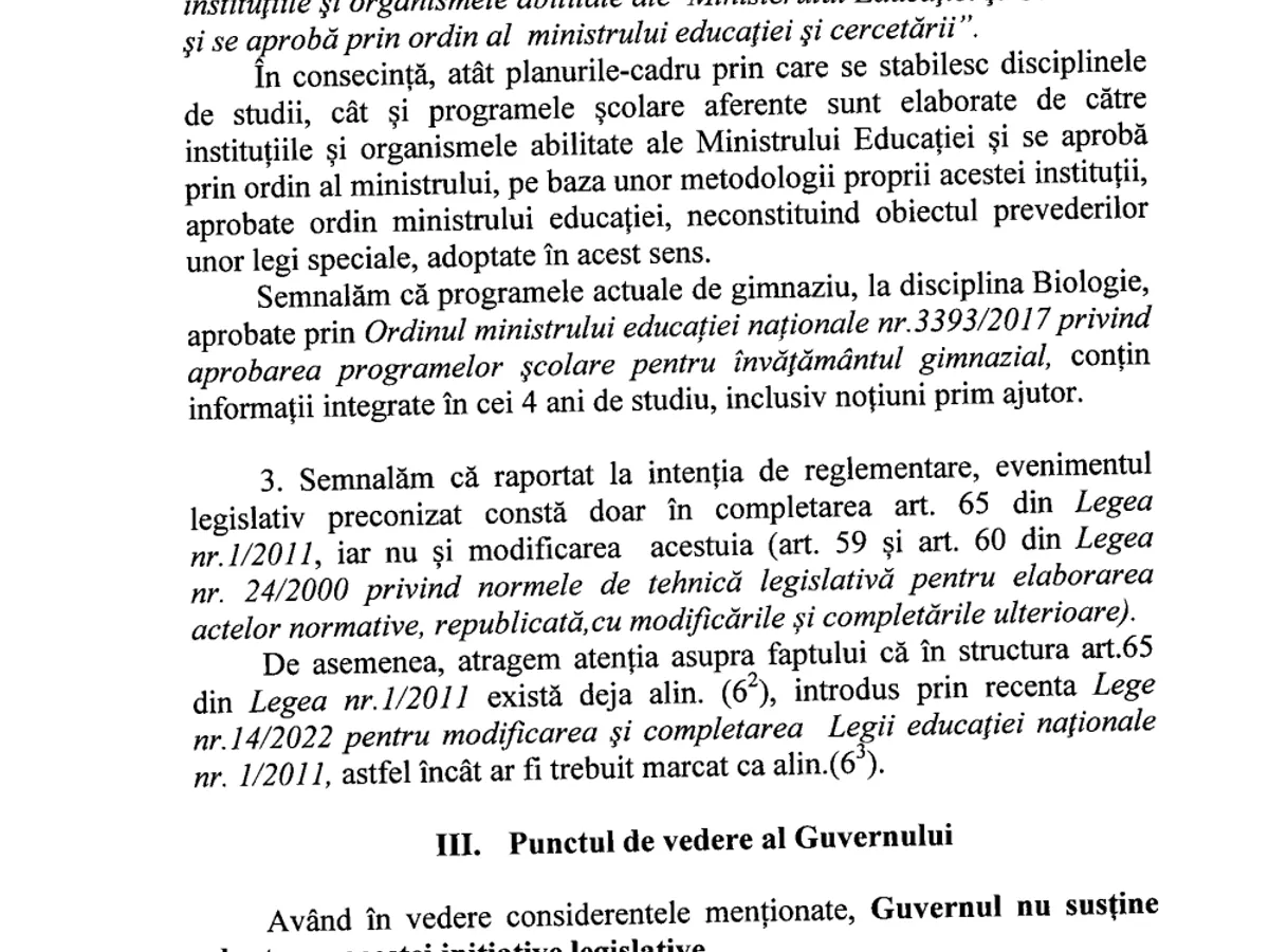 Guvernul susține că nu e necesară colaborarea cu specialiștii din domeniul sănătății deoarece, la nivelul învățământului preuniversitar, nu este necesar personalul specializat în prim-ajutor calificat pentru a ține cursuri pentru primul ajutor de bază”.
