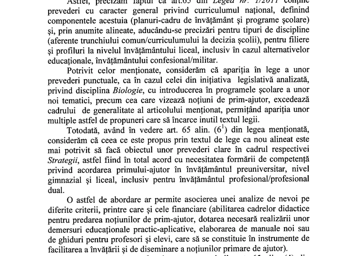 “Pentru disciplina Biologie - Anatomia și fiziologia omului, atât în învățământul gimnazial, cât și în cel liceal, programa școlară va cuprinde și noțiuni de prim ajutor.
