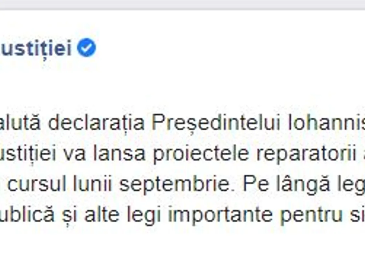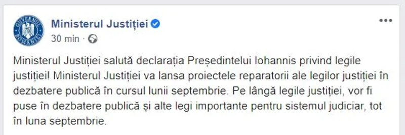 Ministerul Justiției susține, pe pagina de Facebook, că va lansa în dezbatere publică proiectele reparatorii ale legilor justiției în cursul lunii septembrie, anunțul a fost făcut la scurt timp de la declarațiile președintelui Iohannis, care a spus că are „mari speranțe” că în această toamnă vor fi proiecte care să repare legile justiției „ciuntite de PSD”.