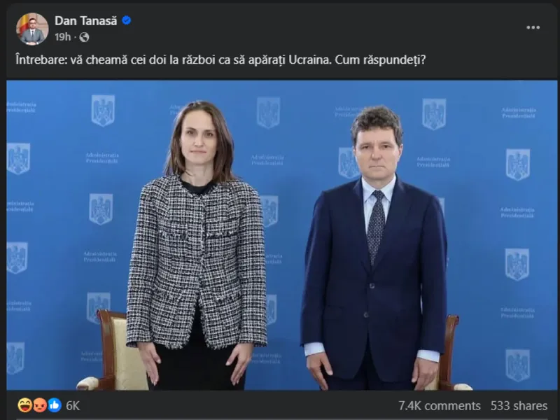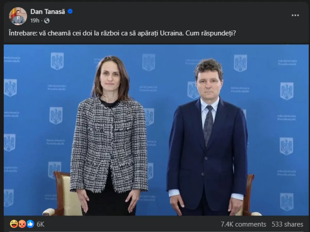 Dan Tanasă a postat pe Facebook o fotografie cu președintele Nicușor Dan și ministrul de Externe, Oana Ţoiu, însoțită de mesajul: „Întrebare: vă cheamă cei doi la război ca să apăraţi Ucraina. Cum răspundeţi?”