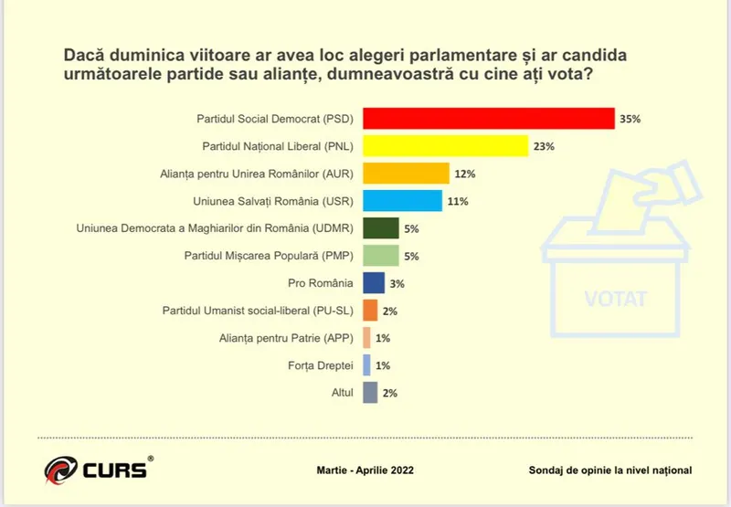PSD ar obţine 35% din voturi dacă duminica viitoare ar avea loc alegeri parlamentare, urmat de PNL cu 23% din voturi şi de AUR - 12%, relevă datele unui sondaj CURS realizat în intervalul 28 martie - 11 aprilie.