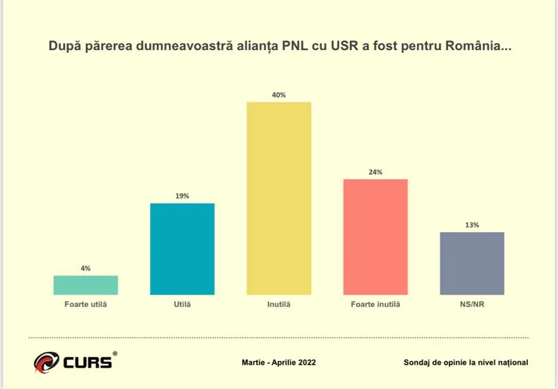 În ceea ce priveşte alianţa PNL-USR, 4% dintre cei chestionaţi consideră că a fost foarte utilă, iar 19% spun că a fost utilă. Proporţia celor care cred că de fapt a fost inutilă este de 40%, iar a celor care o consideră foarte inutilă este 24%.