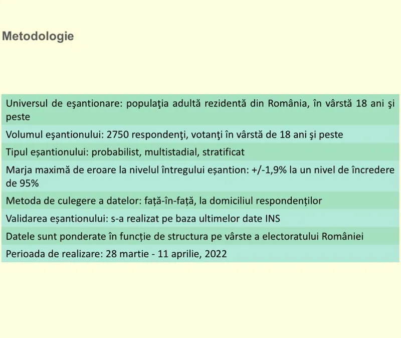 Sondajul a fost realizat la comanda PNL în perioada 28 martie - 11 aprilie, pe un eşantion probabilist, multistadial, stratificat, de 2.750 de repondenţi în vârstă 18 ani şi peste, faţă-în-faţă, la domiciliul respondenţilor. Marja maximă de eroare la nivelul întregului eşantion: +/-1,9% la un nivel de încredere de 95%.