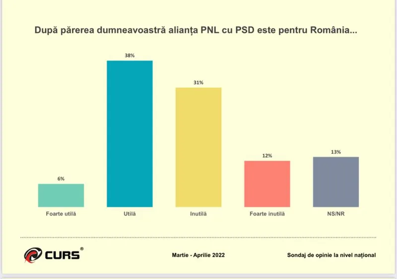 Alianţa PNL - USR este considerată utilă de 19% dintre români şi inutilă de 40%, în timp ce alianţa dintre PNL şi PSD este văzută ca utilă de 38% şi ca inutilă de 31%, mai relevă sondajul CURS.