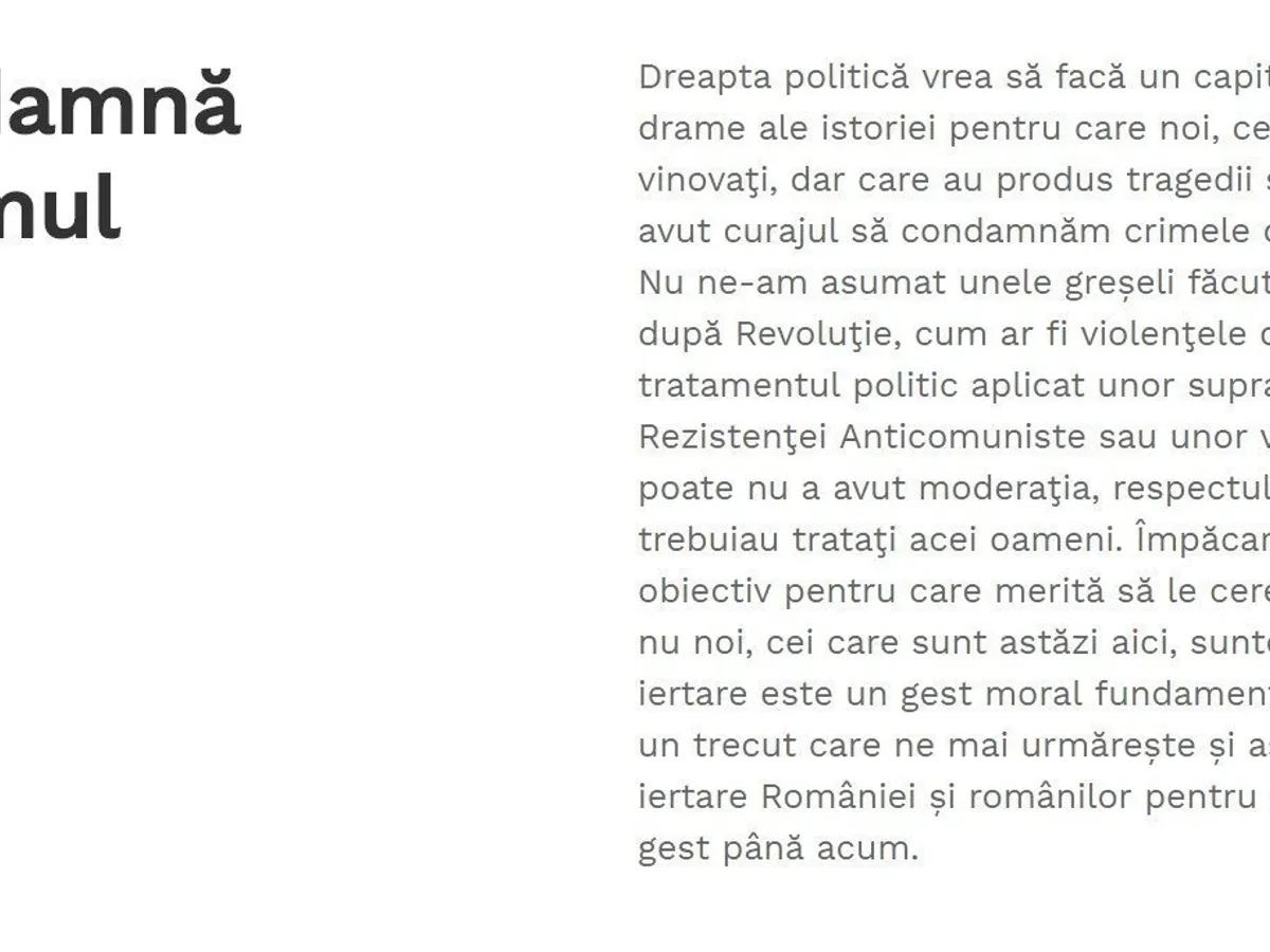 „Dreapta politică vrea să facă un capital politic din unele drame ale istoriei pentru care noi, cei de azi, nu suntem vinovaţi, dar care au produs tragedii și victime. Nu am avut curajul să condamnăm crimele dictaturii comuniste. Nu ne-am asumat unele greșeli făcute în primii ani de după Revoluţie, cum ar fi violenţele din Piaţa Universităţii, tratamentul politic aplicat unor supravieţuitori ai Rezistenţei Anticomuniste sau unor victime ale dictaturii poate nu a avut moderaţia, respectul și deferenţa cu care trebuiau trataţi acei oameni. Împăcarea naţională este un obiectiv pentru care merită să le cerem iertare, chiar dacă nu noi, cei care sunt astăzi aici, suntem vinovaţi. A cere iertare este un gest moral fundamental al despărţirii de un trecut care ne mai urmărește și astăzi. Să cerem iertare României și românilor pentru că nu am făcut acest gest până acum”.