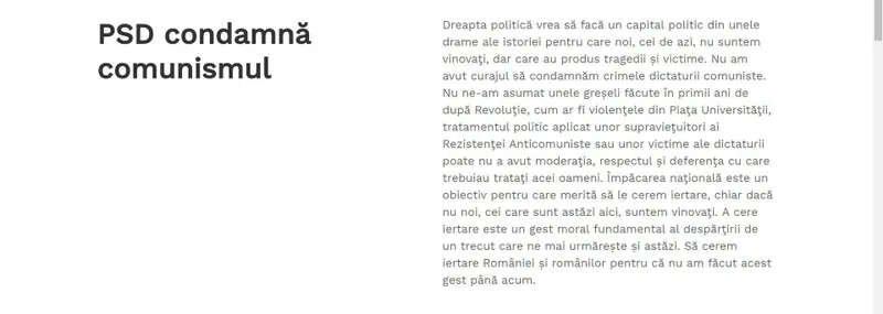 PSD este un partid care nu admite că a greșit. Mereu alții sunt de vină: străinii, multinaționalele, Soros, societatea civilă. Deși au condus țara în ultimii șapte ani, nu își asumă nicio vină pentru faptul că nu au făcut școli, autostrăzi, spitale. De aceea, paradoxal, pe pagina oficială www.psd.ro partidul se scuză că nu a condamnat comunismul și pentru violențele din anii 90 de care se simte responsabil. Partidul își pune cenușă în cap pentru că a lăsat Transilania în uitare. În mod concret, însă, PSD nu a făcut nimic pentru a îndrepta lucrurile.