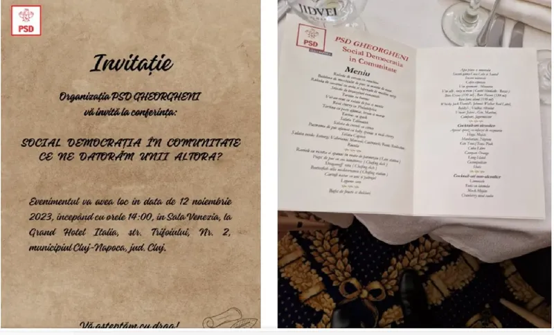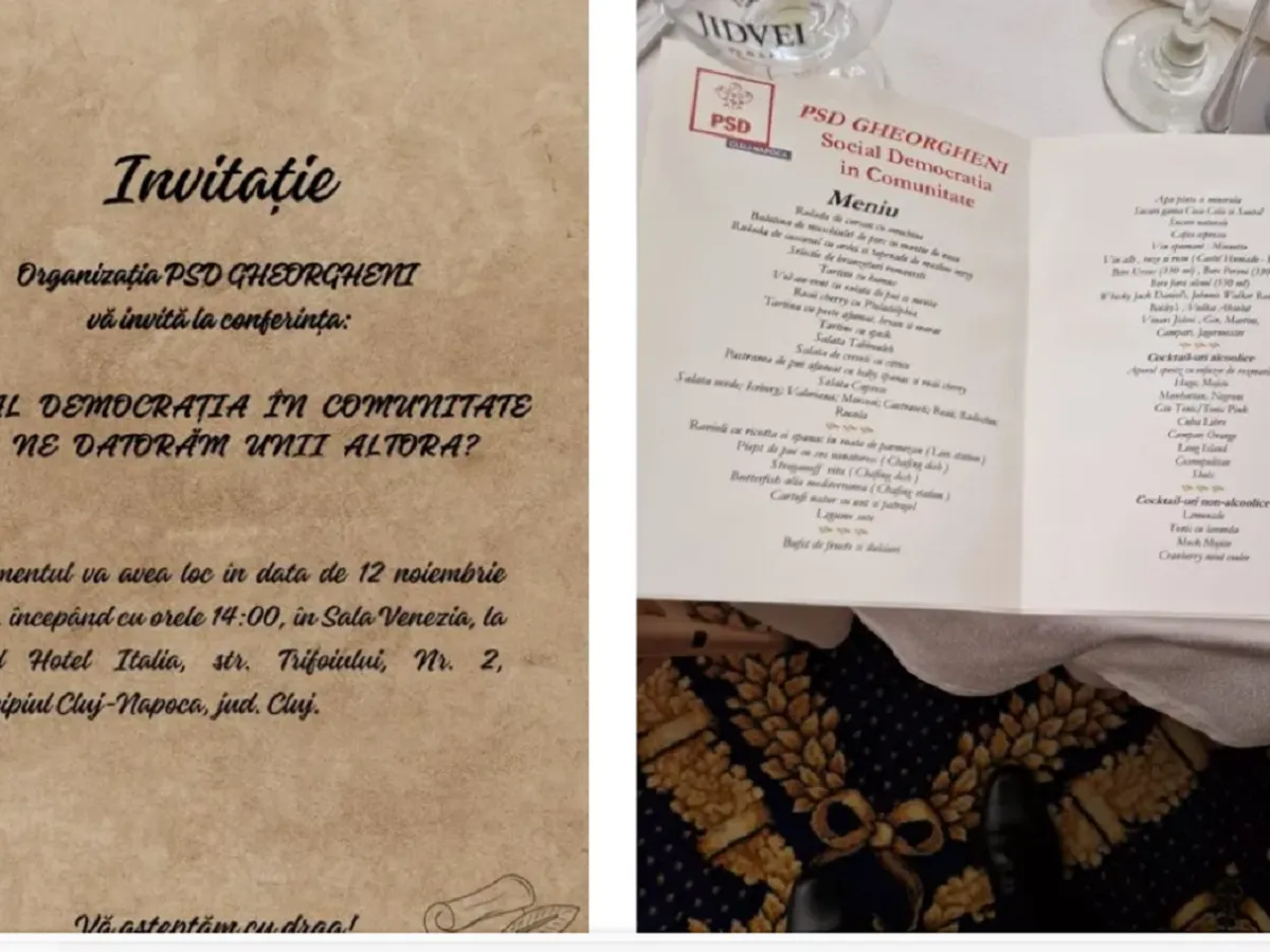 PSD Gheorghieni a făcut o conferință la un hotel unde camera e 700 lei/noapte. Meniul a avut 20 de feluri, printre care regăsim creveți și ravioli, dar și diverse cocktailuri. Printre invitați s-au aflat ministrul digitalizării, dar și Vasile Dîncu.