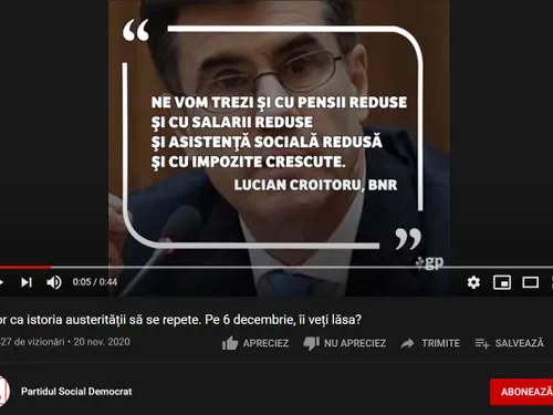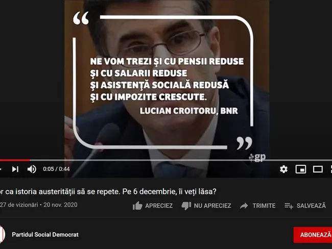 „Banca Naţională a României dezaprobă ferm utilizarea de imagini şi declaraţii mai vechi sau mai noi, scoase din context, ale unor specialişti BNR în spoturi de campanie electorală ale PSD. BNR este o instituţie apolitică, independentă şi utilizarea abuzivă a unor asemenea declaraţii, care nu au conotaţie politică propriu-zisă, afectează statutul şi neutralitatea instituţiei noastre", arată instituția, într-un comunicat de presă.