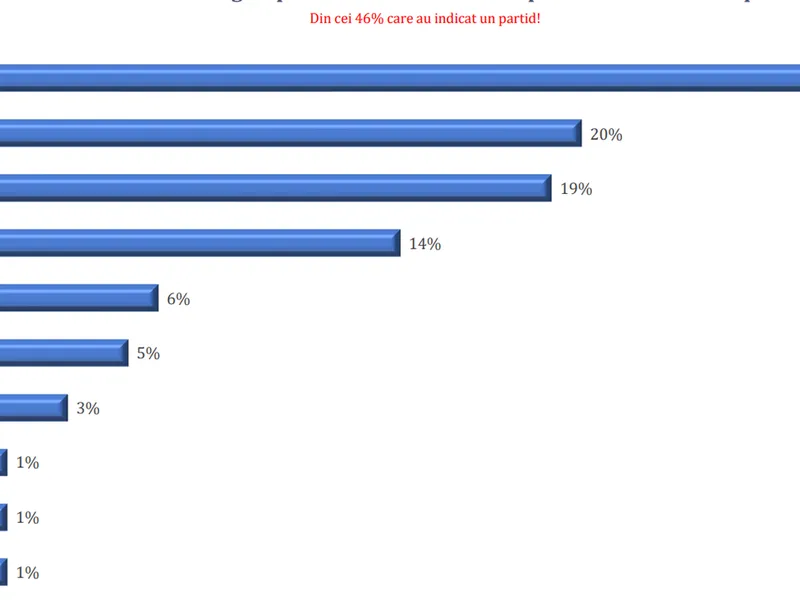 Poziţia a doua revine AUR, urmat la diferenţă de 4% de PNL. USR ar avea în prima variantă 14,6%, iar în cea de a doua 14,1 %.