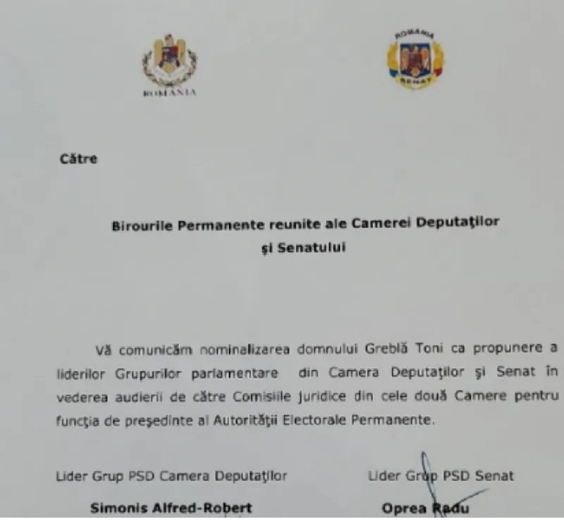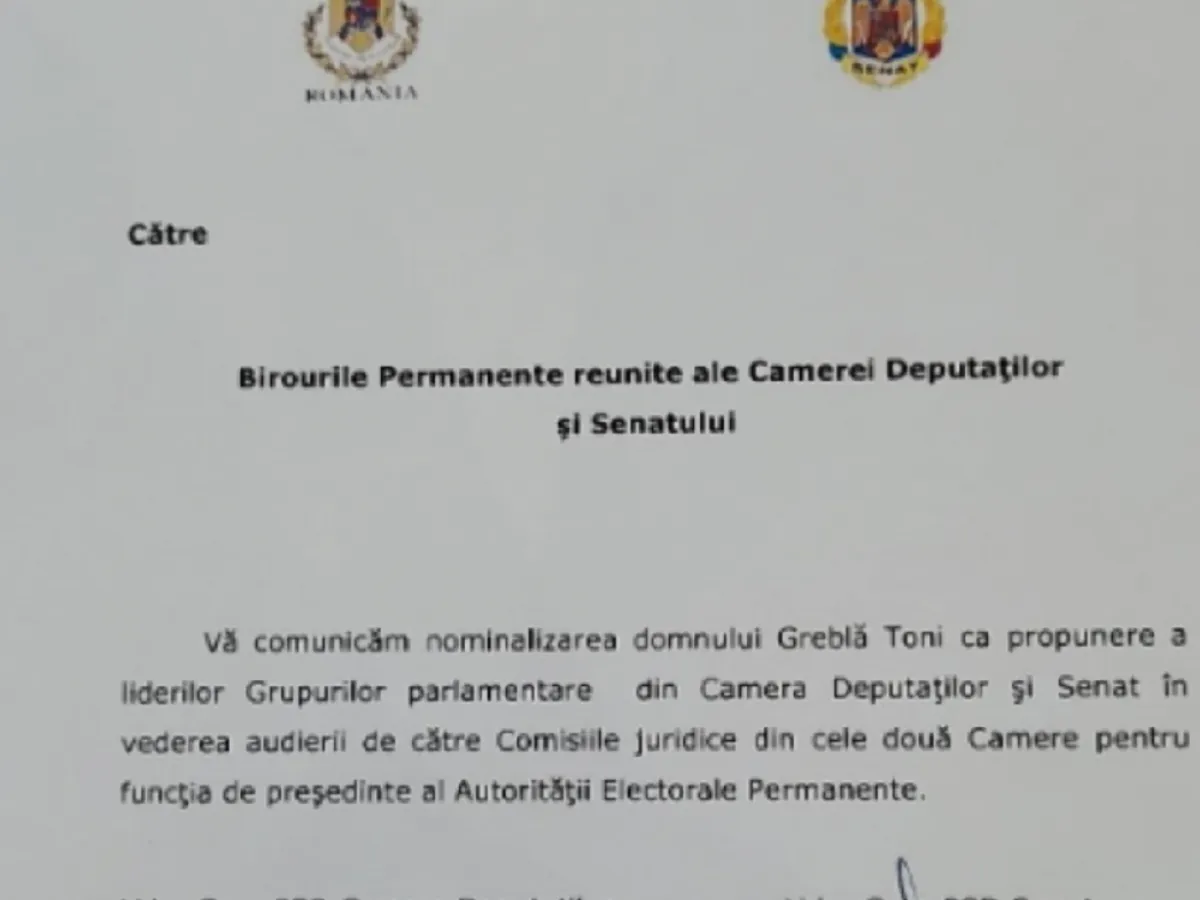 Actualul prefect al Capitalei, Toni Greblă, este propus de către PSD, UDMR și grupul minorităților pentru a prelua șefia Autorității Electorale Permanente (AEP), reiese dintr-un document depus la Parlament.