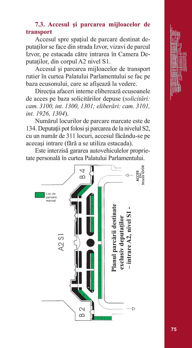 Deputaţii pot folosi şi parcarea de la nivelul S2, cu un număr de 311 locuri, accesul făcându-se pe aceeaşi intrare (fără a se utiliza estacada). Este interzisă gararea autovehiculelor proprietate personală în curtea Palatului Parlamentului.”