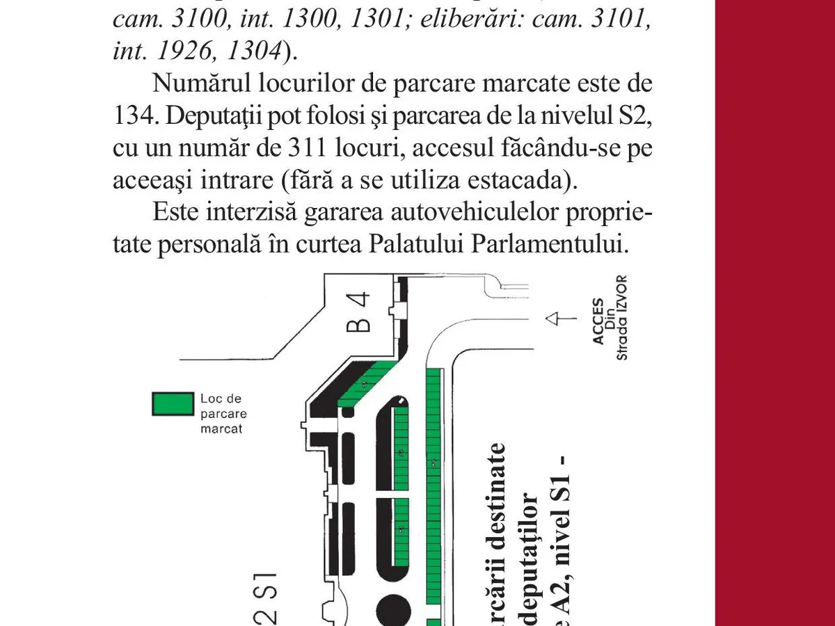 Acest Ghid are 70 de pagini. Într-una din aceste pagini se specifică foarte clar modalitățile de parcare, pe baza căror documente poți parca în interiorul Palatului Parlamentului, unde și când e interzis să staționezi pentru o perioadă mai lungă.