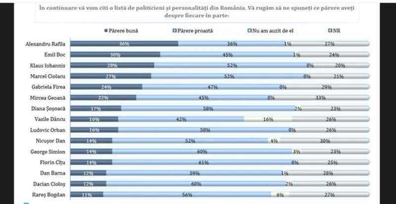 O altă întrebare adresată subiecţilor a avut următoare formulare: ”În continuare vă vom citi o listă de politicieni şi personalităţi din România. Vă rugăm să ne spuneţi ce părere aveţi despre fiecare în parte”, opţiunile fiind: părere bună, părere prosată, nu am auzit de el, nu răspund.
