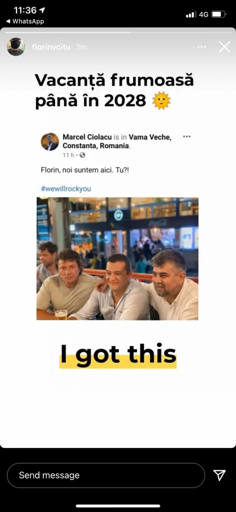 Premierul Florin Cîțu le-a transmis, prin funcția Stories a Instagram și Facebook, “Vacanță frumoasă până în 2028” liderilor PSD Marcel Ciolacu și Sorin Grindeanu, care au postat o fotografie în care se aflau la un restaurant în Vama Veche.