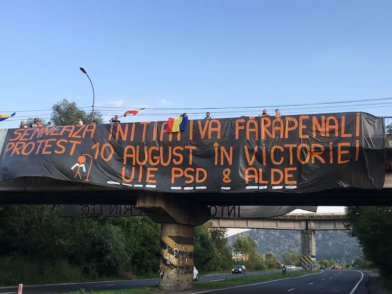 banner pe care scria „UIE PSD & ALDE”. Bannerul chema la semnarea inițiativei USR „Fără penali”.