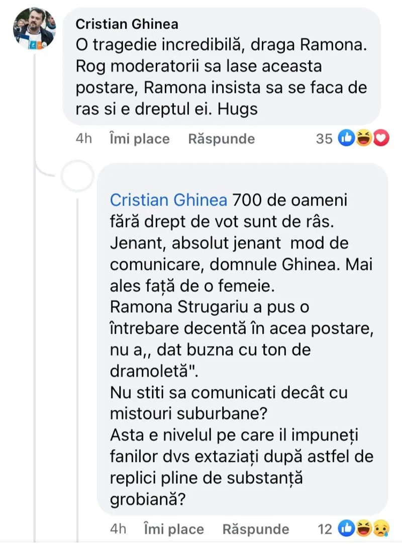 Cristian Ghinea a continuat: „O tragedie incredibiilă, dragă Ramona. Rog moderatorii să lase această postare, Ramona insistă să se facă de râs și e dreptul ei. Hugs”.