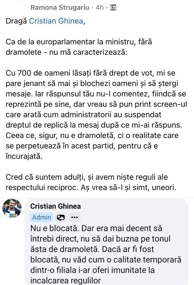 „Dragă Cristian Ghinea, ca de la europarlamentar la ministru, fără dramolete, nu mă caracterizează: cu 700 de oameni lăsați fără drept de vot, mi se pare jenant să mai și blochezi oameni și să ștergi mesaje. (...) vreau să pun print-screen-ul care arată cum administratorii au suspendat dreptul la replică la mesaj după ce mi-ai răspuns. Ceea ce sigur nu e o dramoletă, ci o realitate care se perpetuează în acest partid, pentru că e încurajată”, i-a scris Ramona Strugariu lui Cristian Ghinea.