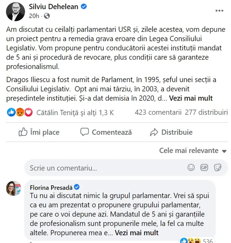 Senatoarea USR Florina Presadă l-a acuzat, pe Facebook, pe deputatul USR Silviu Dehelean că și-a însușit proiectul ei privind modificarea legii de funcționare a Consiliului Legislativ.