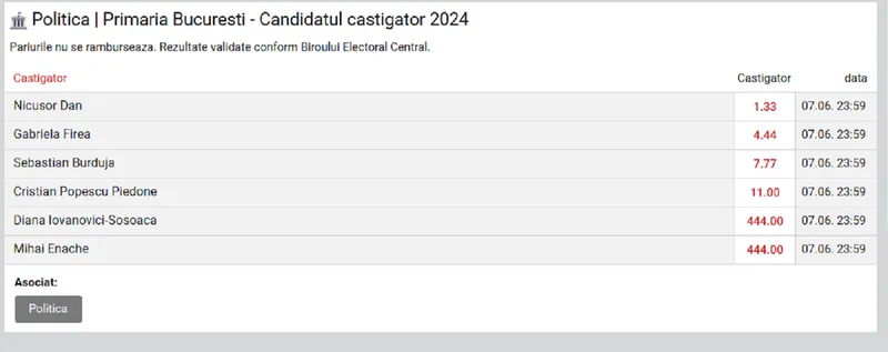 Dacă pariați 100 de lei pe Firea și ea câștigă primiți 433 lei înapoi. La o victorie a lui Nicușor Dan, primiți pentru 100 de lei un profit inifim - 33 de lei.