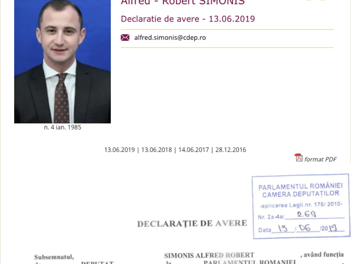 Ultima declarație de avere depusă de Simonis e cea din 15 iunie 2019. Următoarea trebuia să fie de luni, 15 iunie 2020. Dar nu este, după cum se poate vedea pe site-ul Camerei Deputaților.