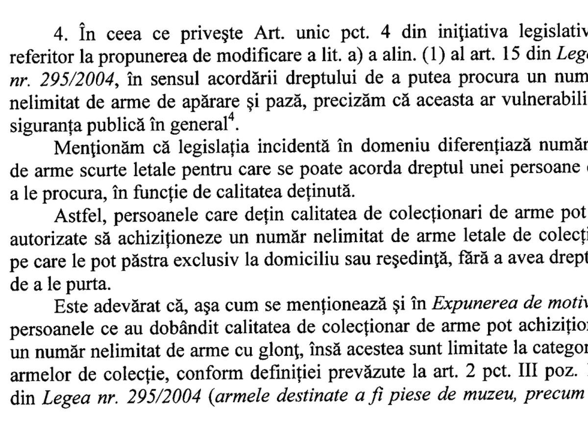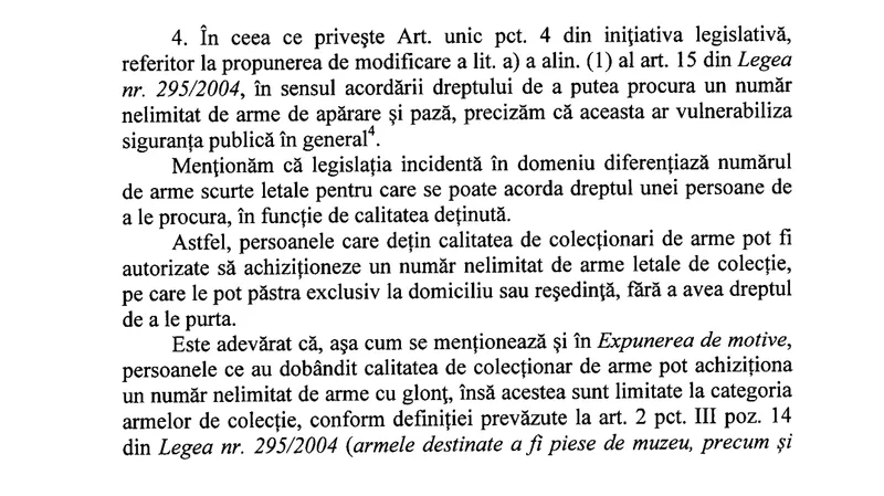 Anul acesta, la Senat a fost depusă „Propunerea legislativă privind modificarea şi completarea Legii nr.295/2004 privind regimul armelor şi muniţiilor”. Potrivit informațiilor de pe senat.ro, termenul de adoptare tacită se împlinește azi.