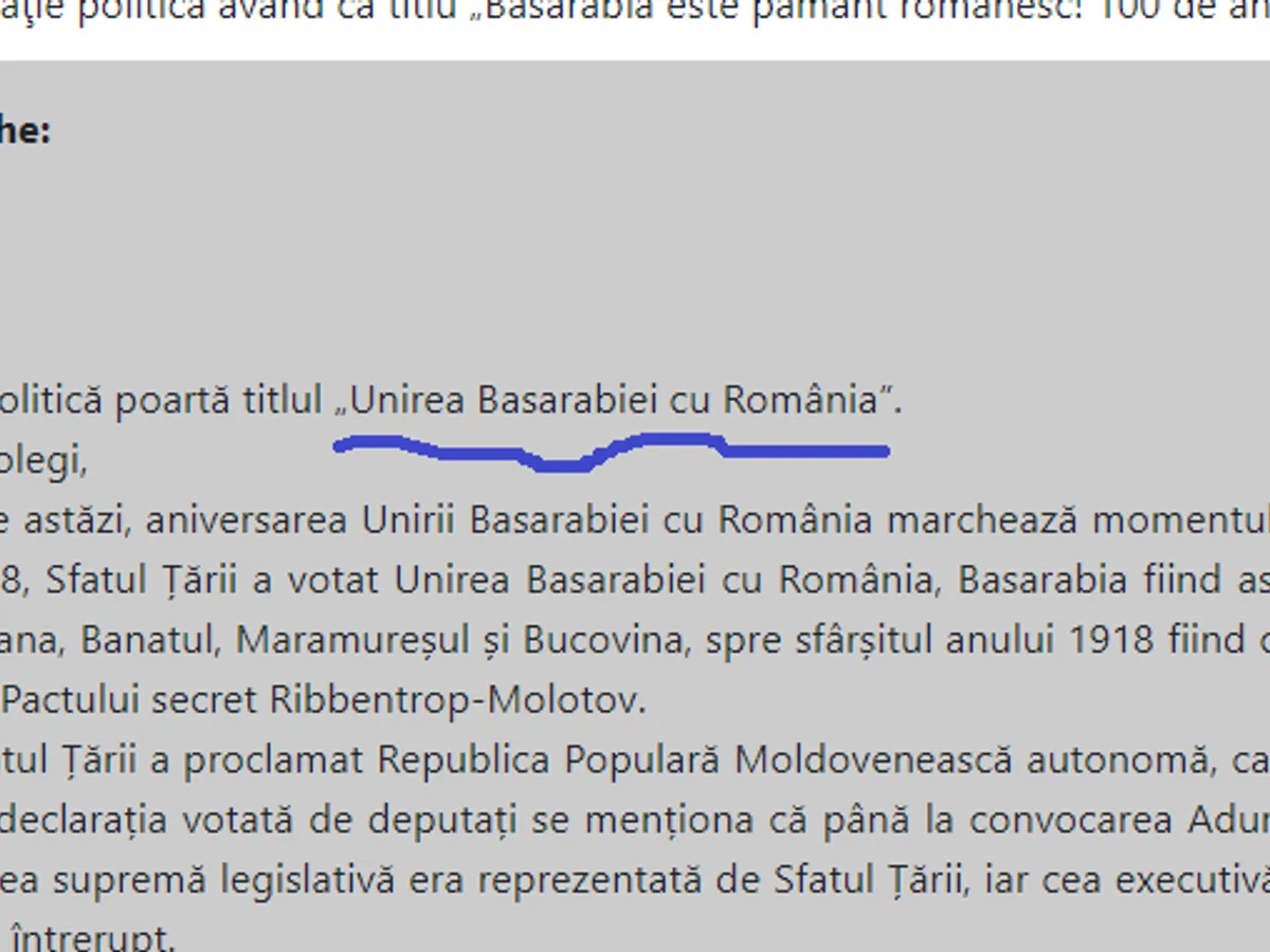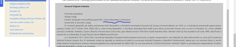 „Declarația mea politică poartă titlul - Unirea Basarabiei cu România. Doamnelor și domnilor colegi, În contextul geopolitic de astăzi, aniversarea Unirii Basarabiei cu România marchează momentul de început al memorabilului an 1918, cu o încărcătură emoțională aparte pentru poporul român. Pe 27 martie 1918, Sfatul Țării a votat Unirea Basarabiei cu România, Basarabia fiind astfel prima dintre provinciile istorice care s-a unit cu România