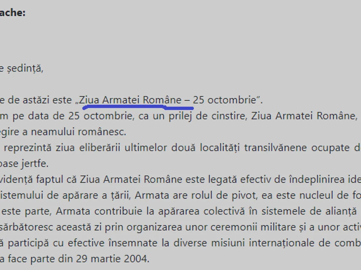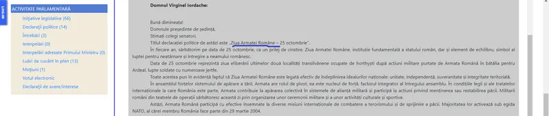„Titlul declarației politice de astăzi este: Ziua Armatei Române – 25 octombrie. În fiecare an, sărbătorim pe data de 25 octombrie, ca un prilej de cinstire, Ziua Armatei Române, instituție fundamentală a statului român, dar și element de echilibru, simbol al luptei pentru neatârnare și întregire a neamului românesc”.