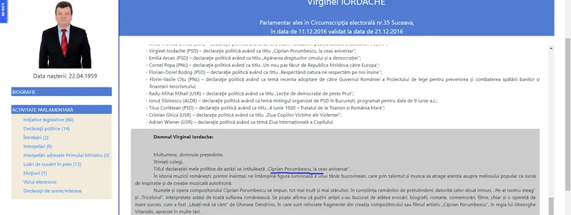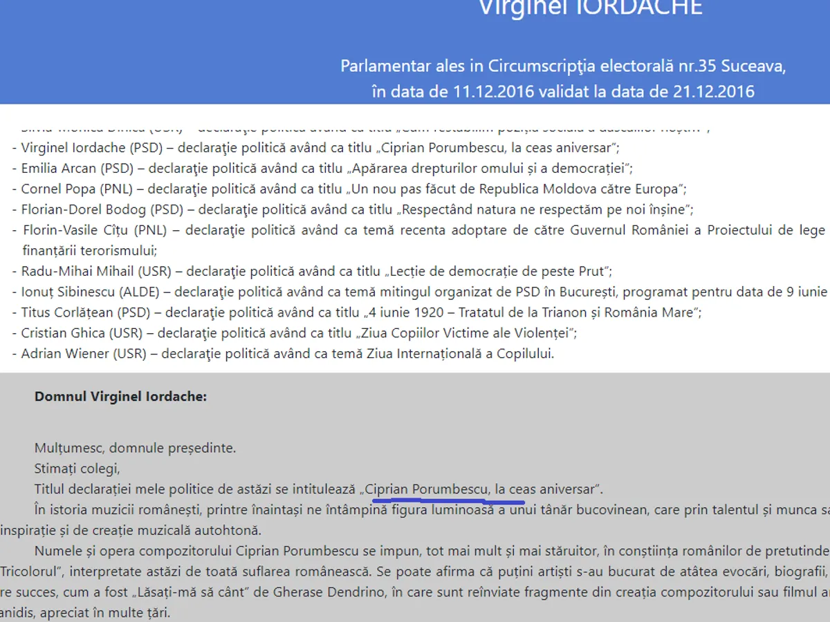 „Titlul declarației mele politice de astăzi se intitulează - Ciprian Porumbescu, la ceas aniversar. În istoria muzicii românești, printre înaintași ne întâmpină figura luminoasă a unui tânăr bucovinean, care prin talentul și munca sa atrage atenția asupra melosului popular ca sursă de inspirație și de creație muzicală autohtonă”.