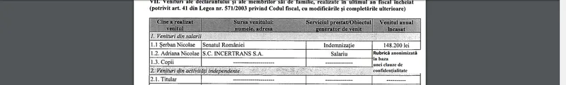 La capitolul „venituri” ale soției Adriana Nicolae găsim aceeași specificate: „rubrică anonimizată în baza unei clauze de confidențialitate”. În document se menționează că Adriana Nicolae este angajată la Institutul de Cercetări în Transporturi SC. Incertrans SA. Compania nu pare una „sensibilă”. Ea activează, cu o tradiție de peste 80 de ani în domeniul transporturilor.